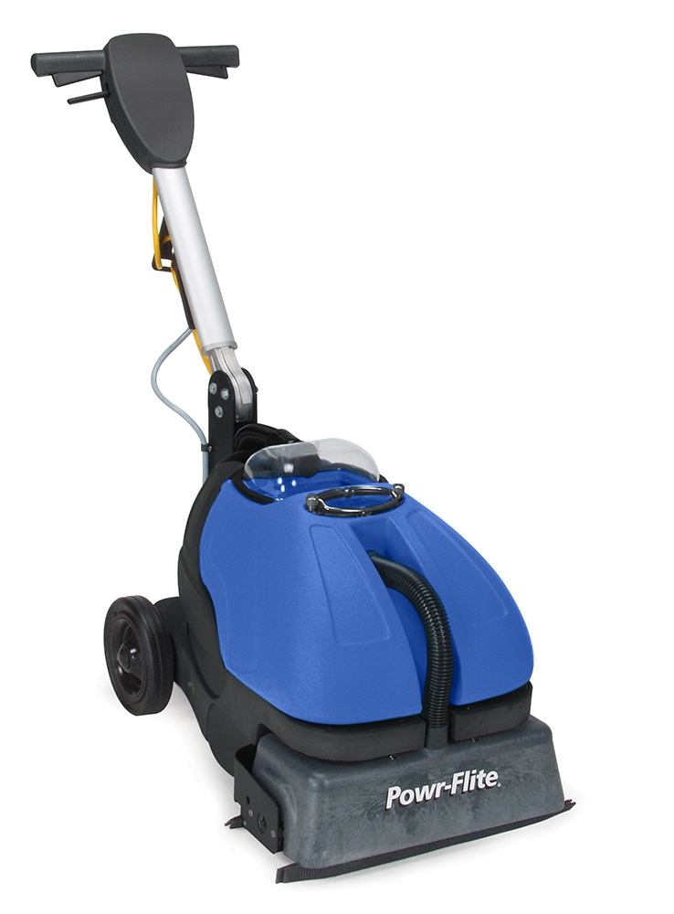 Powr-Flite 16″ compact automatic scrubber w/ grout cleaner designed to clean any hard floor type including non-slip, safety or textured floors with exceptional cleaning power. Ideal for small or medium areas. Includes pair of Standard Scrub Cylinder Brushes. With its intuitive controls and adjustable settings, the CAS16 offers ease of use and customization to suit various floor types and cleaning requirements. 750 RPM high-pressure cylindrical brush for maximum cleaning performance on uneven or tiled flooring. Powerful brush and vacuum action restores ceramic tile floor right down to the grout. Dual floating squeegees clean and dry in forward and backward for more efficient cleaning and increased productivity. Cleans right to the edge with optional add-on side brush. Quiet 70 dBA operator noise level for day cleaning applications.