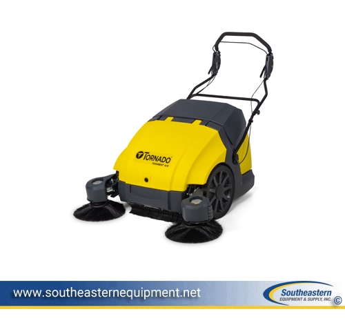 Torrent 43 Walk-Behind Battery Sweeper has 43″ Cleaning path, Weight 273 lbs., 17-gal Capacity, Productivity per Hour 47,361 sq ft/hr. and Traction drive, Charge Time 8hrs, Sound Level 62 dB (A), Main Brush Type – Cylindrical, Side Brush Type (2x) Rotary, Dimensions (L x W x H) (in.) 65 x 32 x 47. Torrent 43 features an innovative Tandem Roller System (TRS) with dual counter-rotating brushes that effectively capture everything from large debris to dirt and sand. Maximize productivity and efficiently clean large spaces with the ability to cover over 47,000 sq. ft./hr., two foldout side brooms with an expandable sweeping path range of 35.4”-43” wide, and battery run time of up to 2.5 hours. With oversized 14” front wheels and a strategically positioned rear caster wheel, this sweeper has superior maneuverability and effortless handling in tight spaces and over cracks in pavement, thresholds, and uneven hard surfaces.